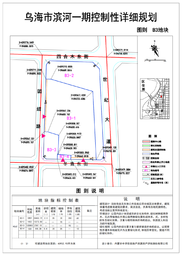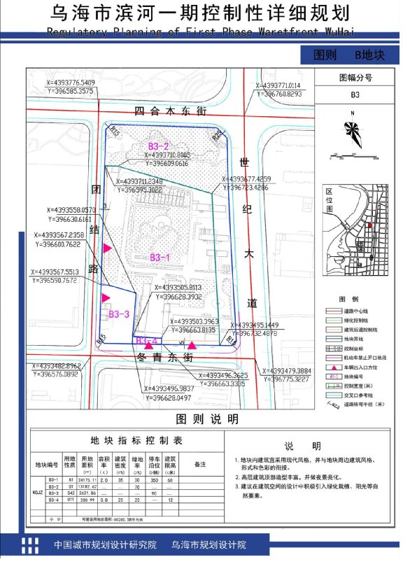本项目调整地块为《乌海市滨河一期控制性详细规划》中B3地块,北至四合木街,南至冬青东,西临团结路,东至世纪大道。